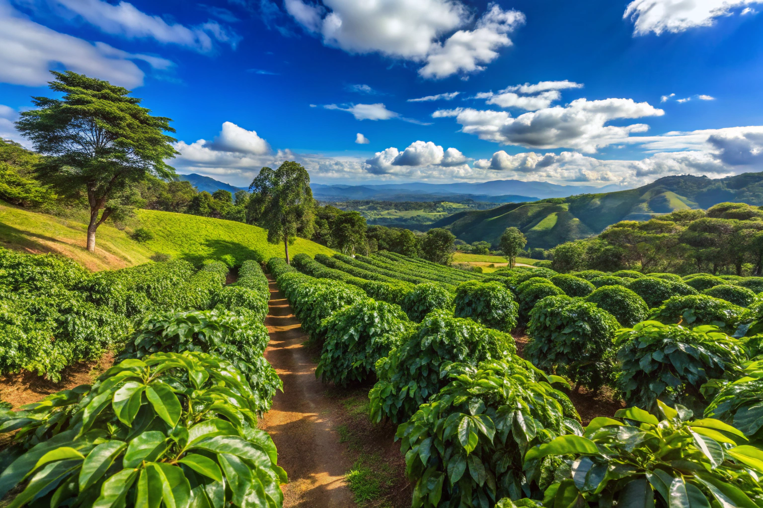 Ein Bild einer idyllischen Kaffeefarm mit Reihen von Kaffeepflanzen, die in terrassierten Hängen wachsen, umgeben von üppiger Vegetation unter einem sonnigen Himmel, ohne erkennbare Markierungen oder Text